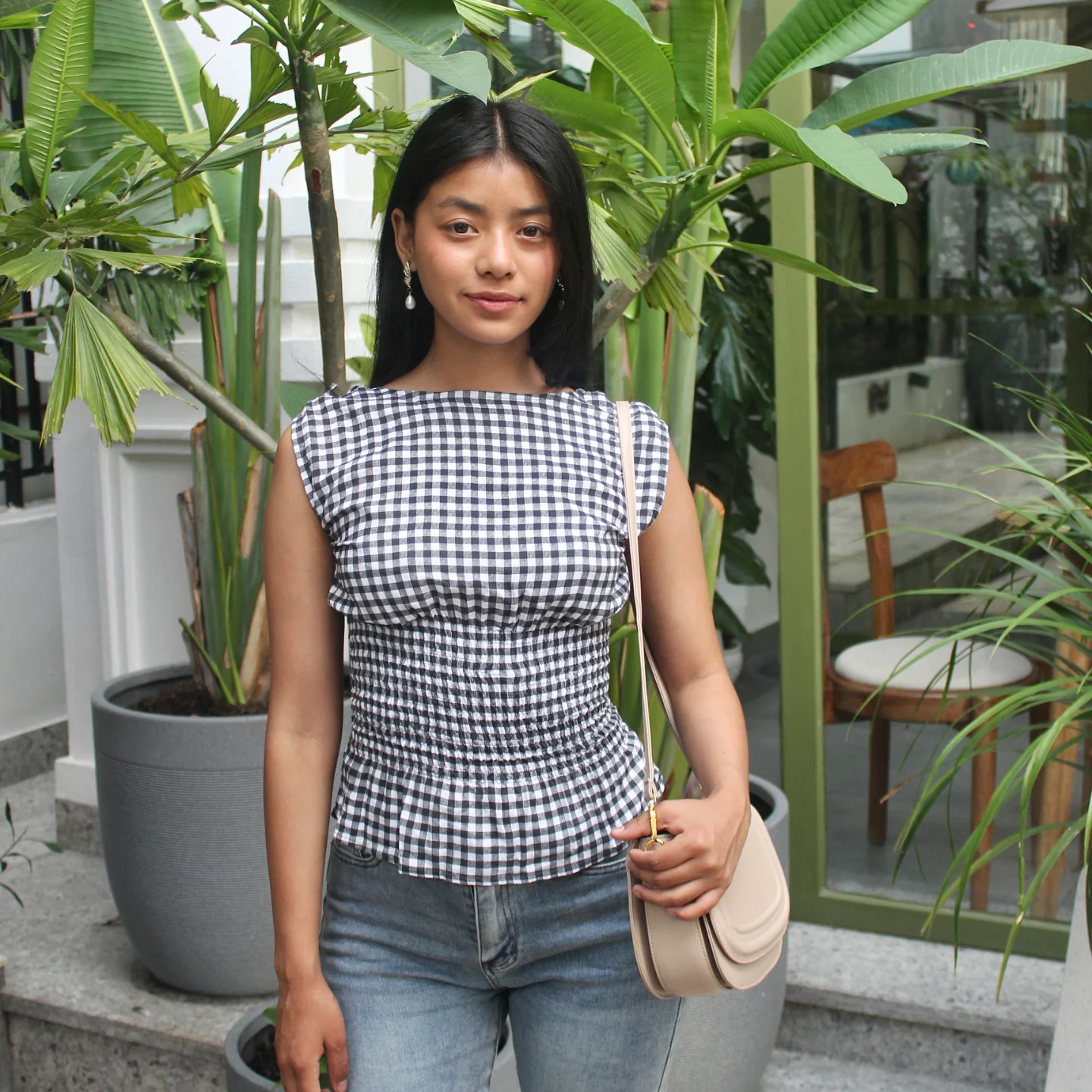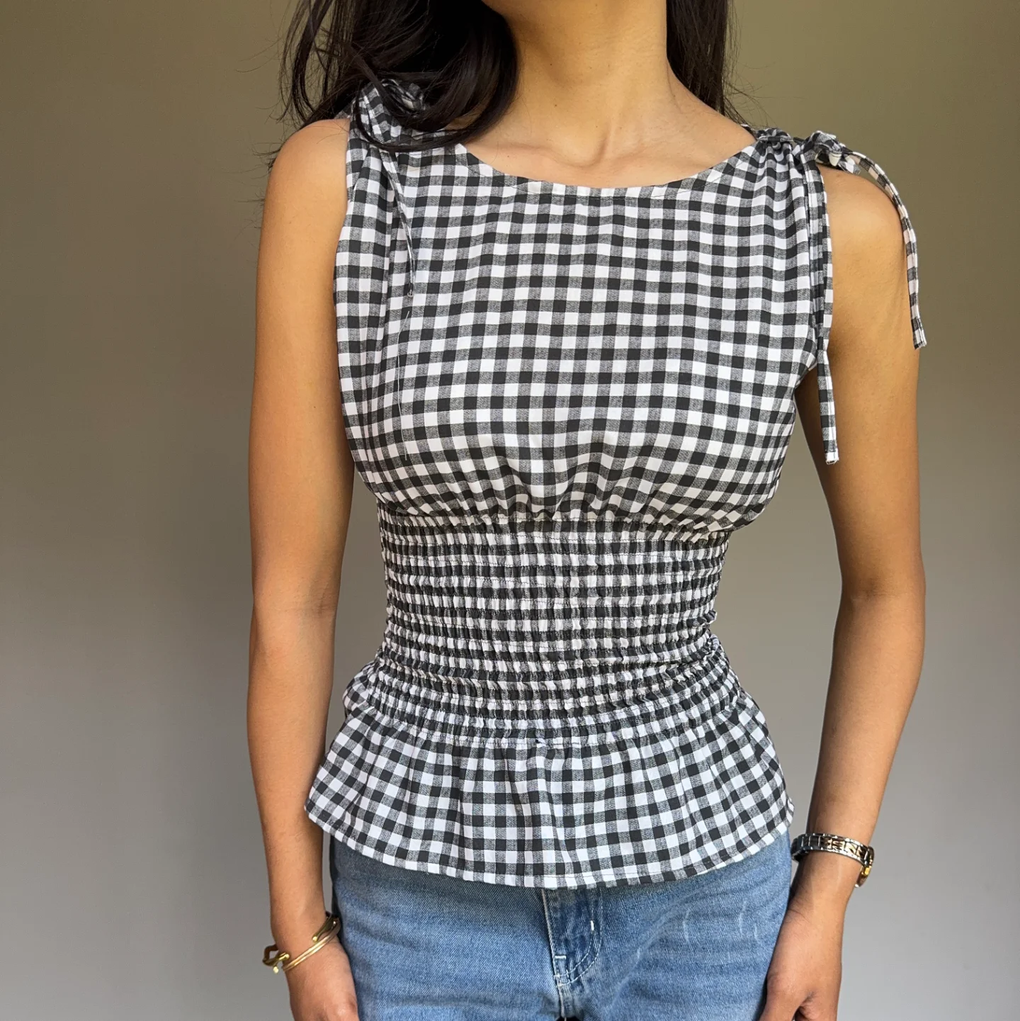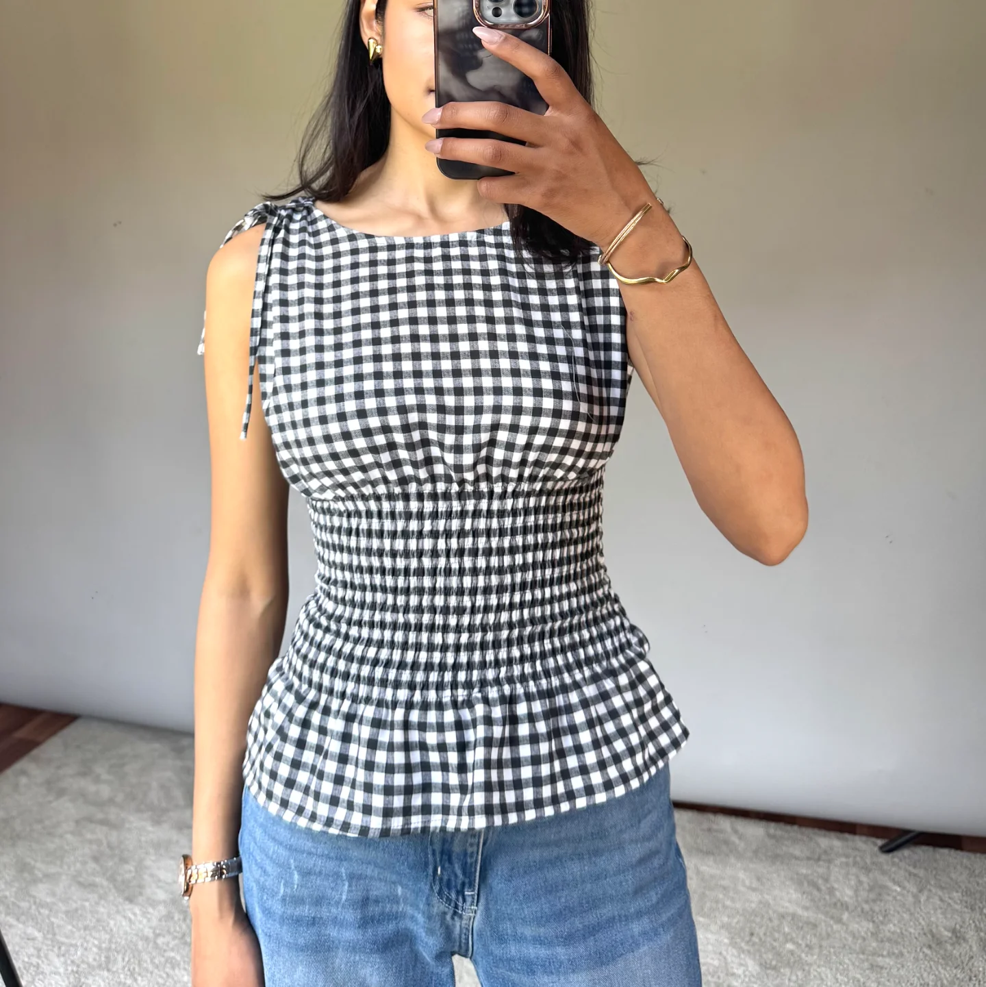 Timeless with a twist, this black and white gingham top is designed to flatter and flow with ease. Featuring a classic square neckline, adjustable tie-up shoulders, and a smocked waist that cinches beautifully before flaring into a soft peplum, it blends comfort and charm effortlessly. Made from lightweight cotton, it’s the kind of piece that works just as well for laid-back weekends as it does for casual brunches.