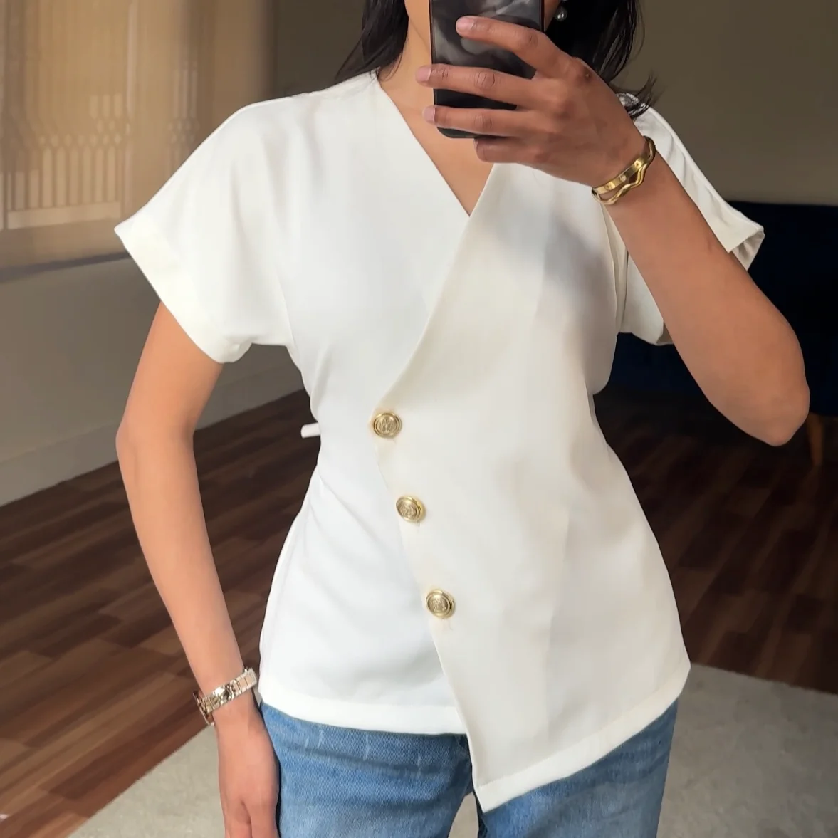 Features a sleek asymmetric silhouette with a flattering V-neckline and structured short sleeves. The statement gold-tone buttons add just the right amount of polish, making it perfect for both work and after-hours.