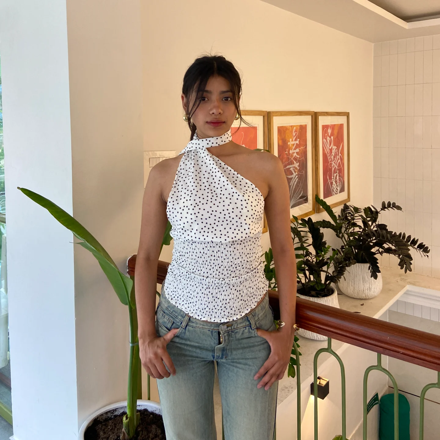 Playful, polished, and ready for sunny days. This halter neck top features an elegant twist-front neckline and a flattering shirred waist that hugs your shape just right. Designed in a classic white-and-black polka dot print, the subtle layered bodice detail adds dimension without overwhelming the look. Feminine and versatile, it pairs perfectly with denim or tailored trousers for an easy day-to-night transition.