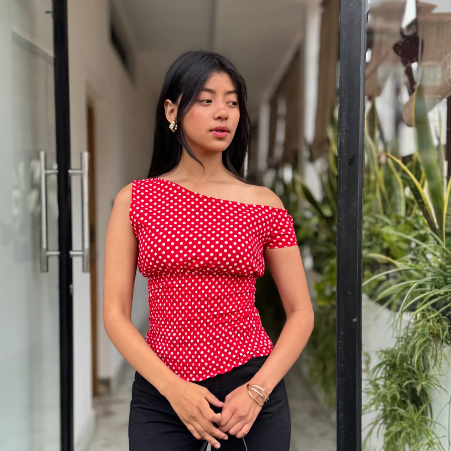 A playful take on timeless polka dots, this one-shoulder top exudes effortless charm. Designed with an elegant off-the-shoulder neckline, it features a flattering shirred waist that accentuates your silhouette. The lightweight, breathable fabric ensures all-day comfort, while the bold pattern adds a touch of whimsy to any outfit. Perfect for brunch dates, summer evenings, or adding flair to your everyday wardrobe.